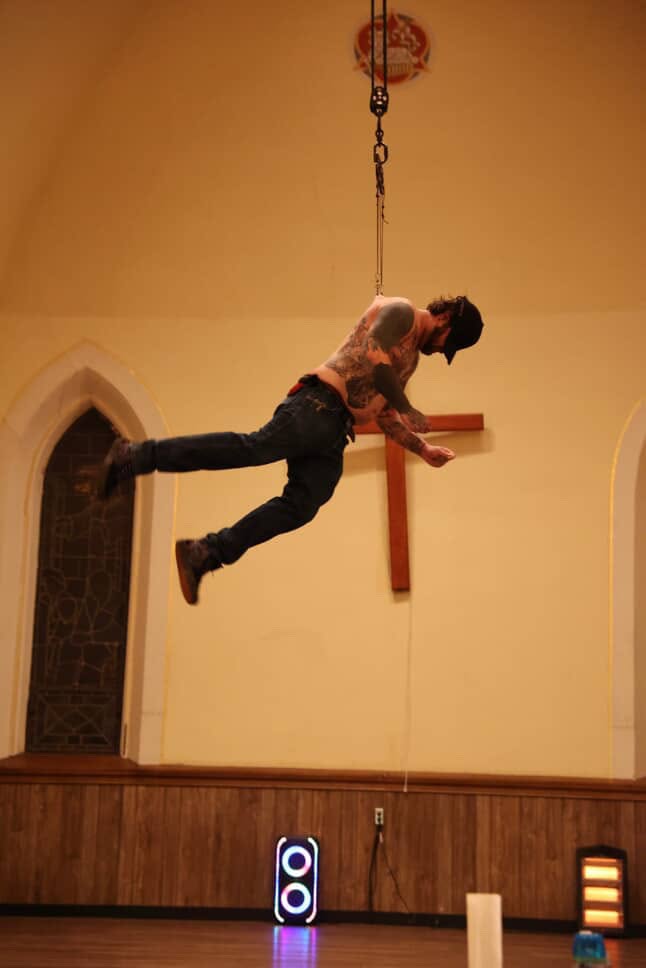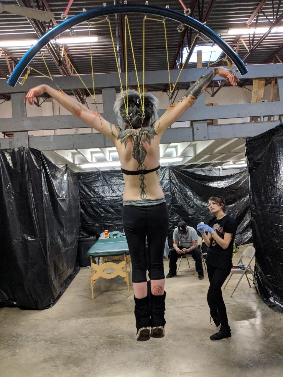 CHRIS: I remember the piercing of the hooks being more painful than the actual suspending. Even so, each hook was done very quickly. Personally, I hate getting shots or blood drawn but it has more to do with the anticipation and dread leading up to it than the actual event. I found suspension to be sort of like that. Once I told myself, “This is happening, calm down, you’re going to be fine,” it became a perspective that was much easier to handle.
